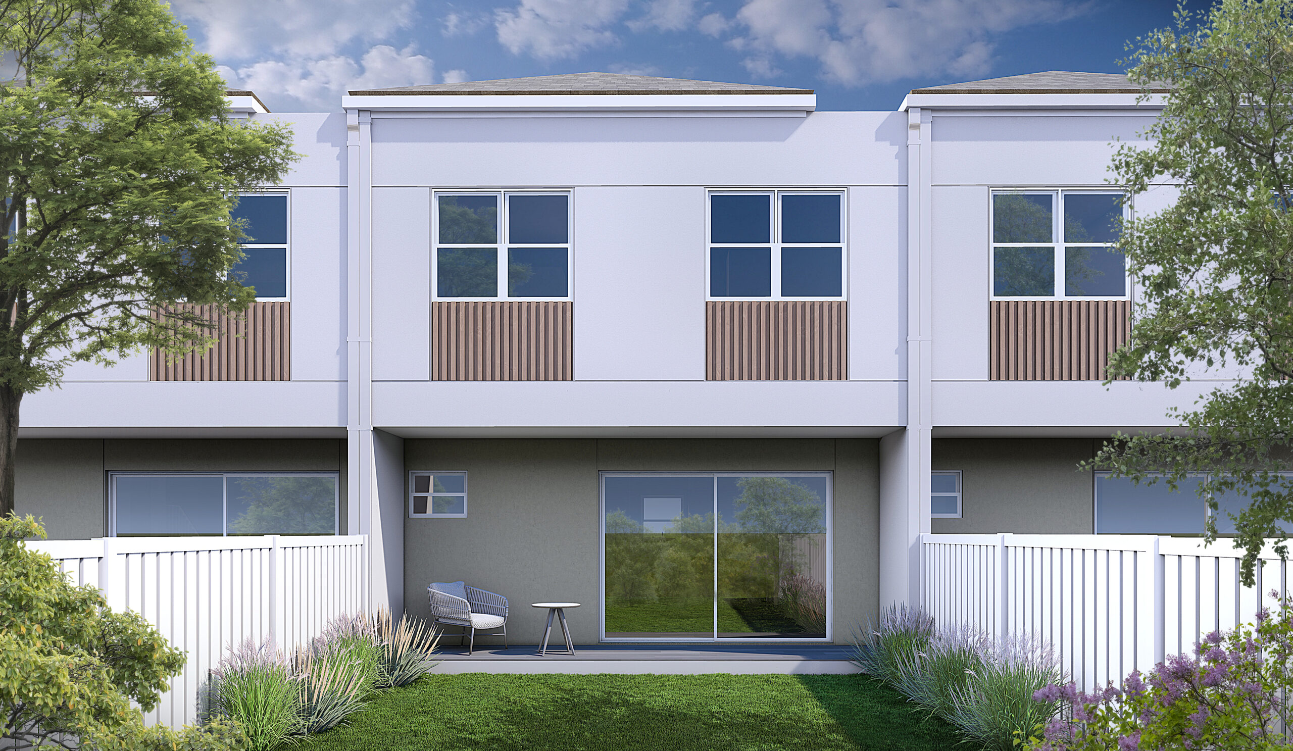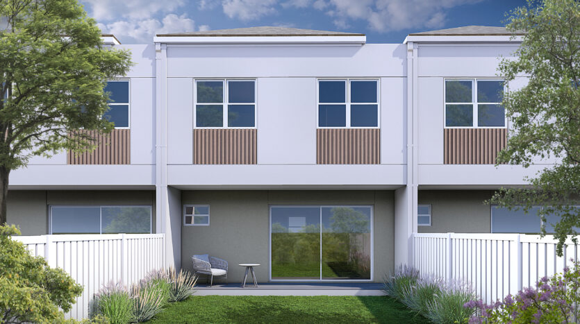 One of the available home designs is Cascade (pictured), a spacious three-bedroom, two and a half-bathroom residence featuring an open-plan layout, a fully equipped kitchen with appliances, a master suite with a walk-in closet, a large patio, a paved parking area, a fenced backyard, and a landscaped garden.